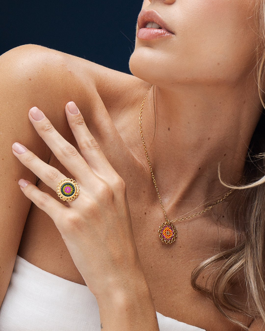 Cada pieza está cargada de magia y simbolismo. Fusionamos culturas, ideologías y técnicas de México, los pueblos Wixárika y culturas del mundo para crear esta joya que te acompañará en tu vida.