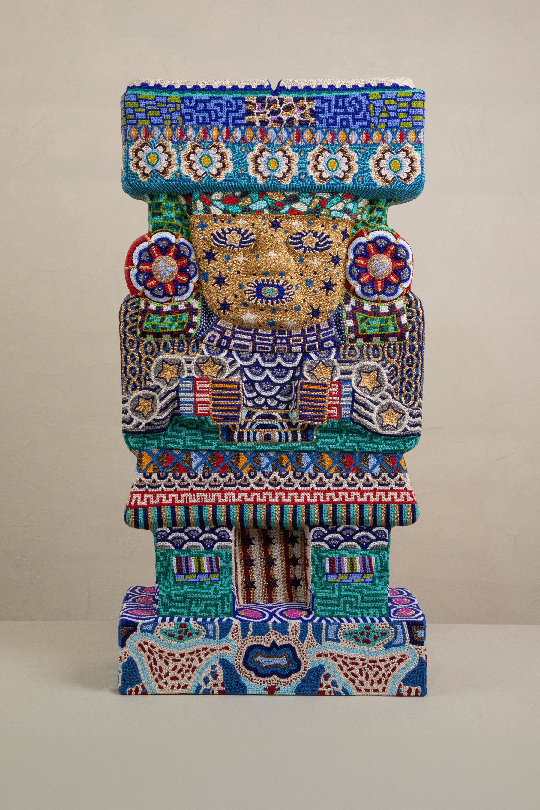 Pieza diseñada por Sofía Berlanga. Creada en resina con marmolina y cubierta con cristales checos, esta escultura fue intervenida por artesanas wixárikas que honran sus raíces y técnicas ancestrales.