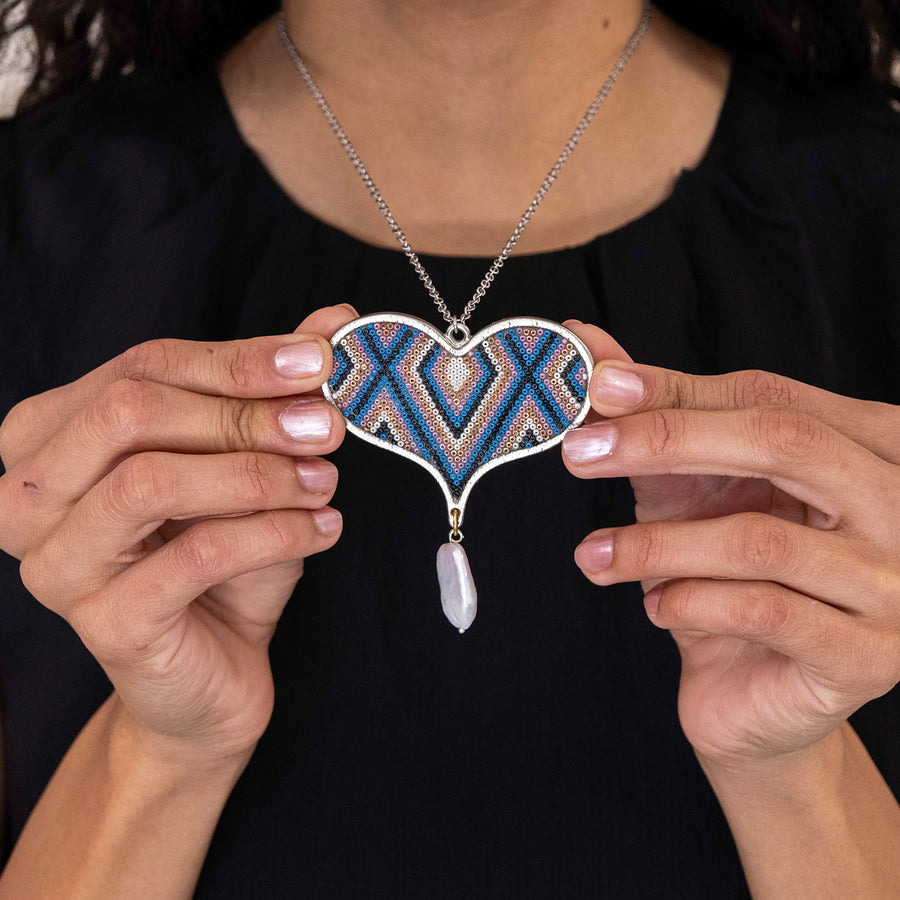 Esta pieza ha sido creada por artesanas Wixárikas (Huicholes) mediante una técnica ancestral que se ha transmitido de generación en generación. Cada cristal es incrustado en un proceso de meditación activa, que permite a los artesanos entrar en comunión con lo divino. Esta pieza no solo refleja la maestría artesanal, sino también la profunda conexión espiritual de la cultura wixárika, transformando cada joya  en un vínculo sagrado entre el arte y el espíritu.