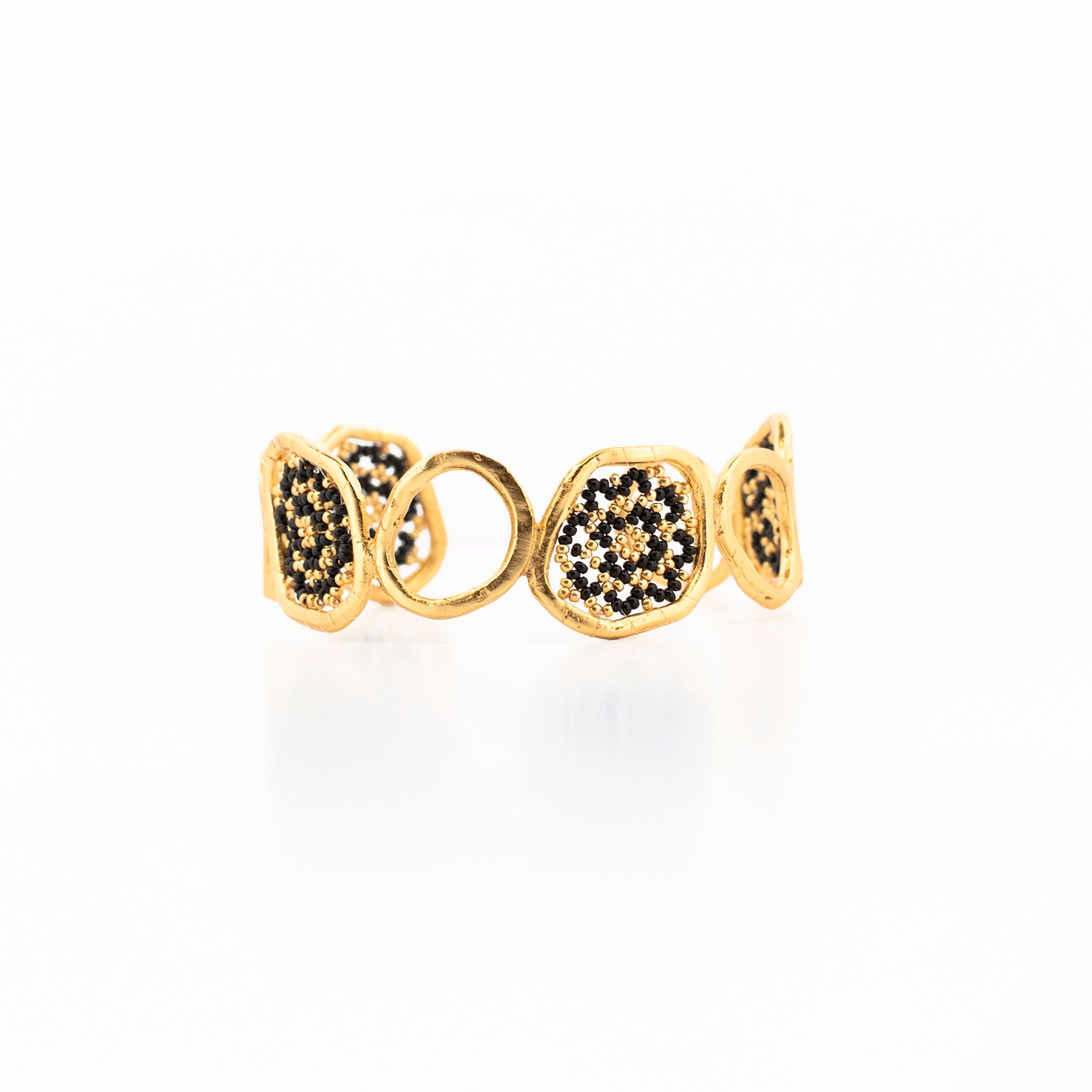 Forjada en latón con baño de oro de 24k y cristales checos, esta pieza es intervenida por artesanas wixárikas desde el respeto a su herencia cultural.