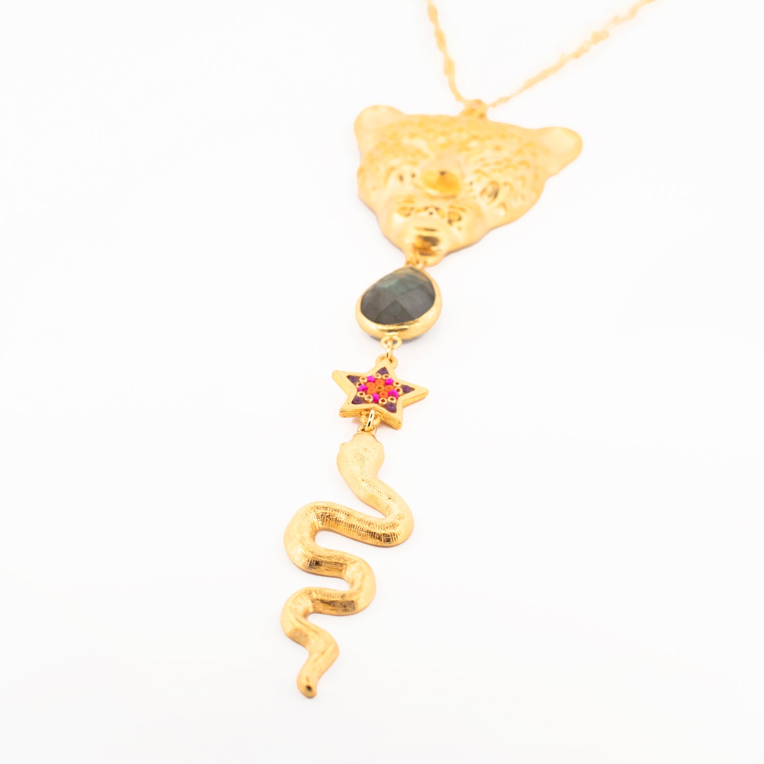 Pieza realizada en latón con baño de oro de 24k, labradorita y cristales checos, intervenida por artesanas wixárikas que preservan técnicas ancestrales vivas.