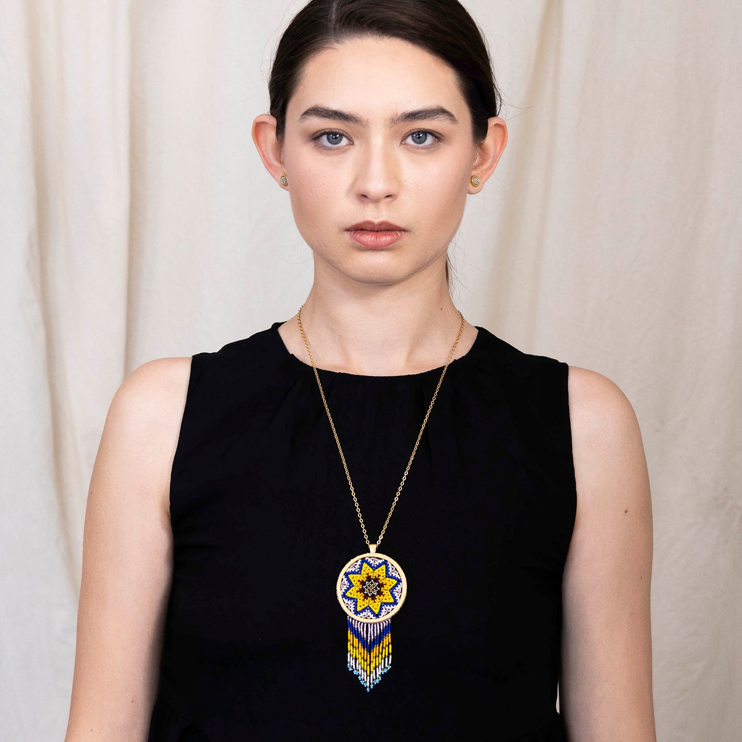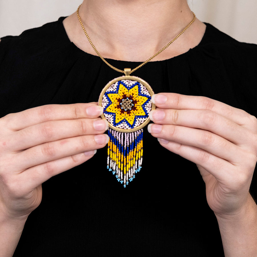 Esta pieza ha sido creada por artesanas Wixárikas (Huicholes) mediante una técnica ancestral que se ha transmitido de generación en generación. Cada hilo es entrelazado en un proceso de meditación activa, que permite a los artesanos entrar en comunión con lo divino. Esta pieza no solo refleja la maestría artesanal, sino también la profunda conexión espiritual de la cultura wixárika, transformando cada joya  en un vínculo sagrado entre el arte y el espíritu.