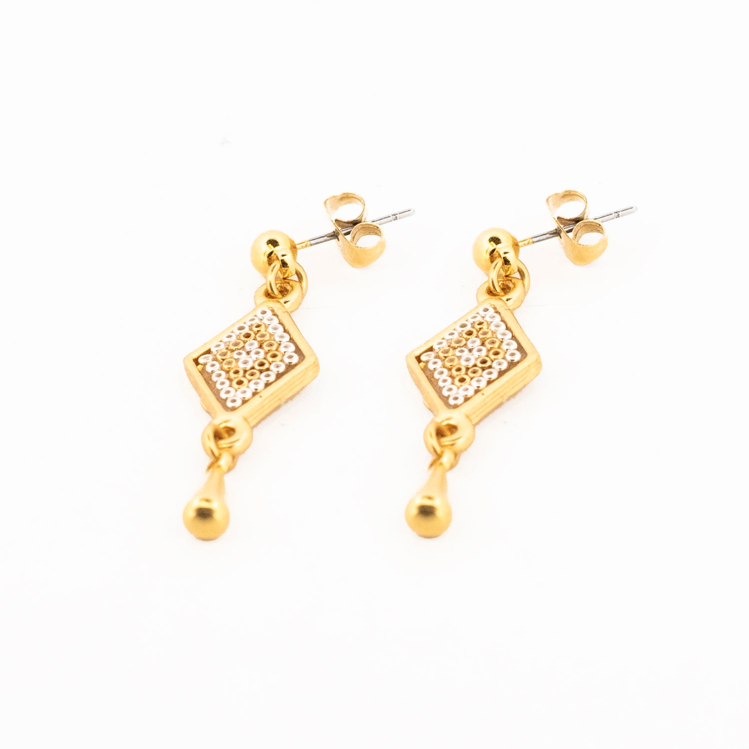 Mini rombos con detalles en forma de gotas, trabajados  a mano por artesanos wixárikas con cristal checo.