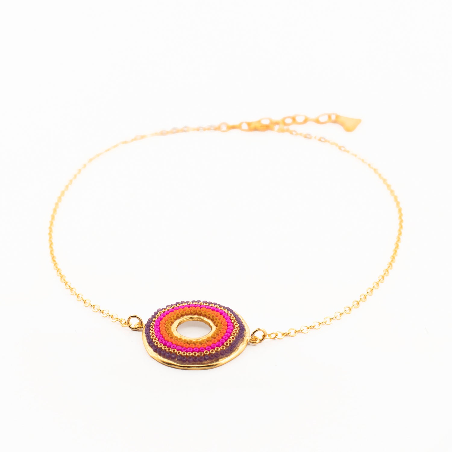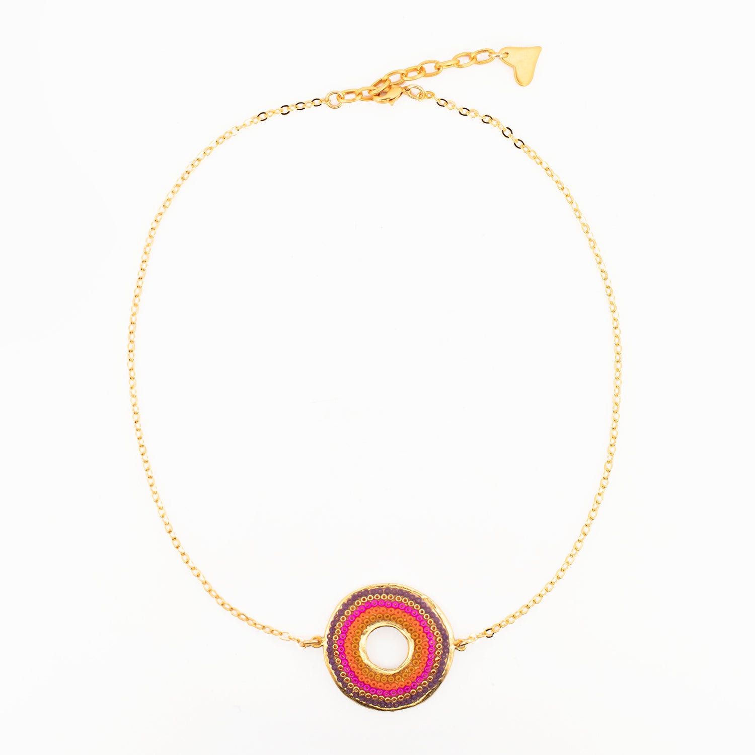 Pieza realizada en latón con baño de oro de 24k y cristales checos, intervenida por artesanas wixárikas que preservan técnicas ancestrales vivas.