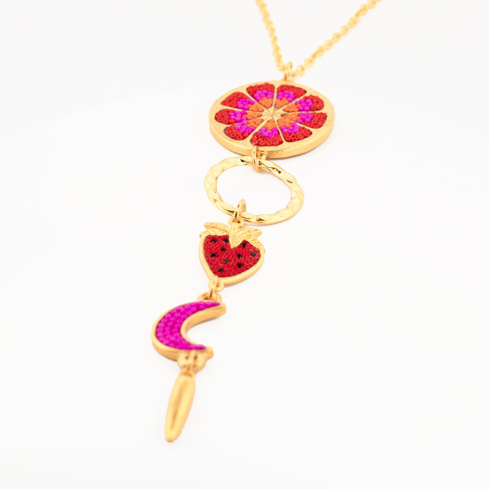 Collar Ajustable con tres dijes, intervenidos a mano por artesanos Wixárikas (Huicholes). El trabajo artesanal es una práctica mísitica, una forma de meditación activa con la cual los artesanos entran en comunión con lo divino.